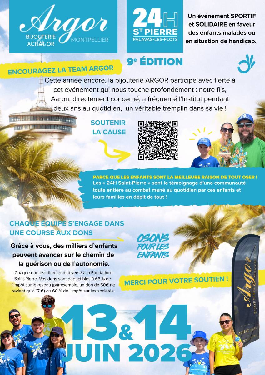 La bijouterie Argor Montpellier est fière de vous annoncer sa 3ᵉ participation aux 24h de Saint-Pierre, un défi caritatif qui se déroulera les 13 & 14 juin 2026.